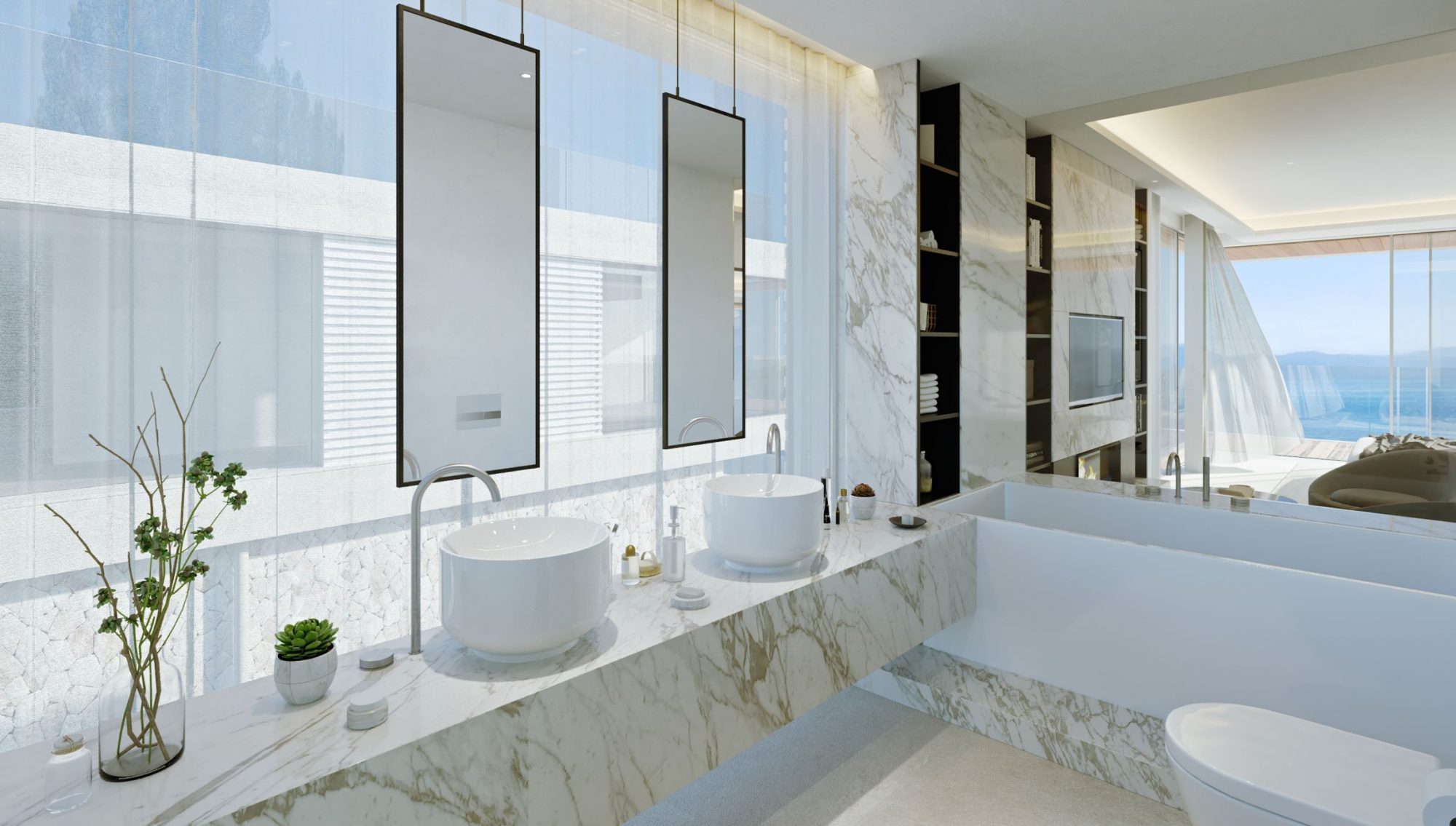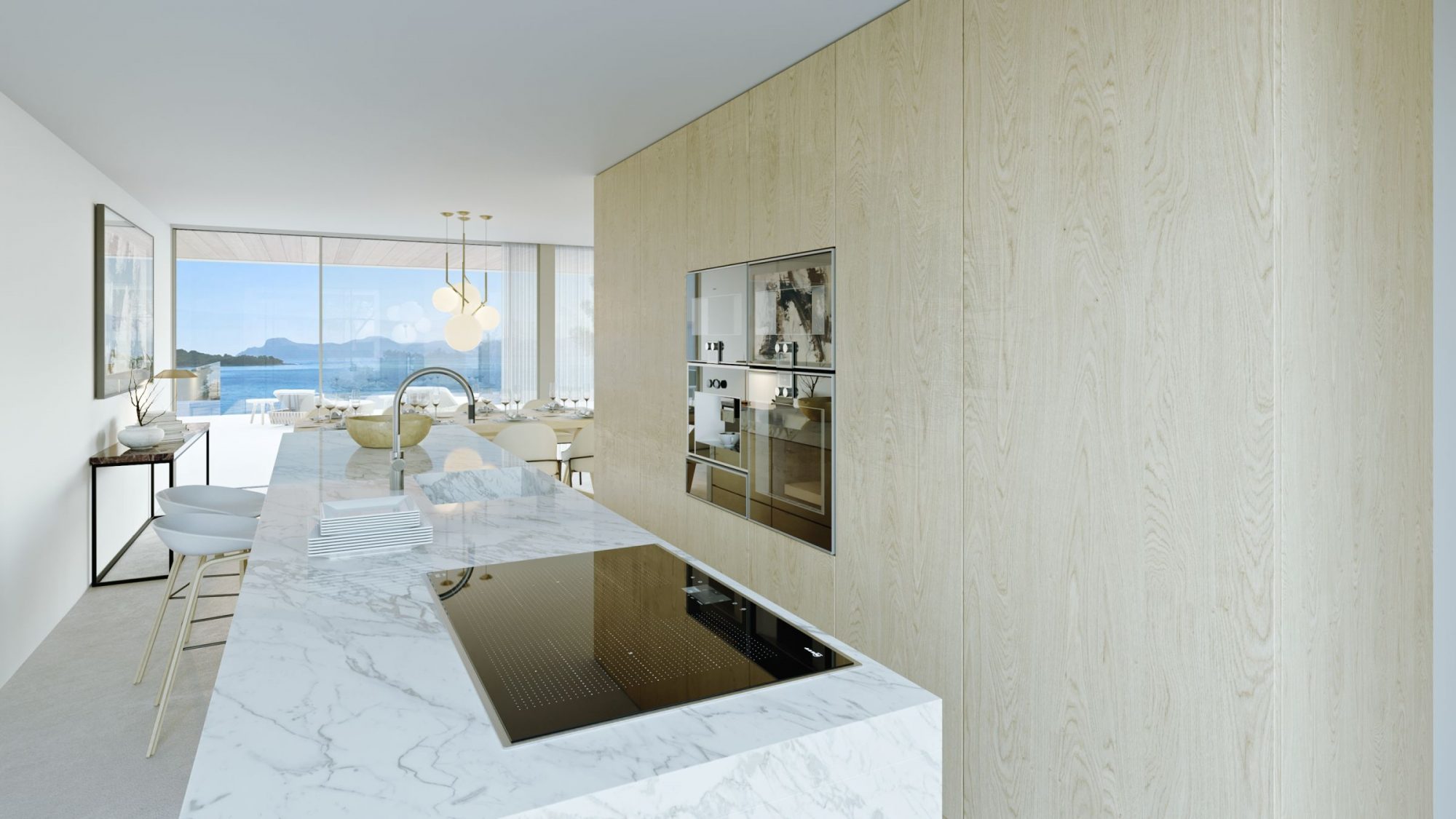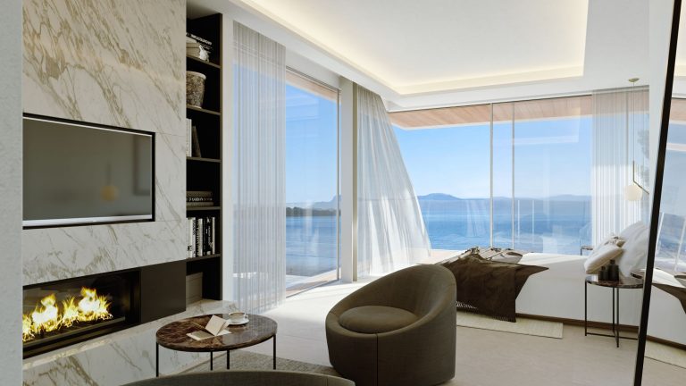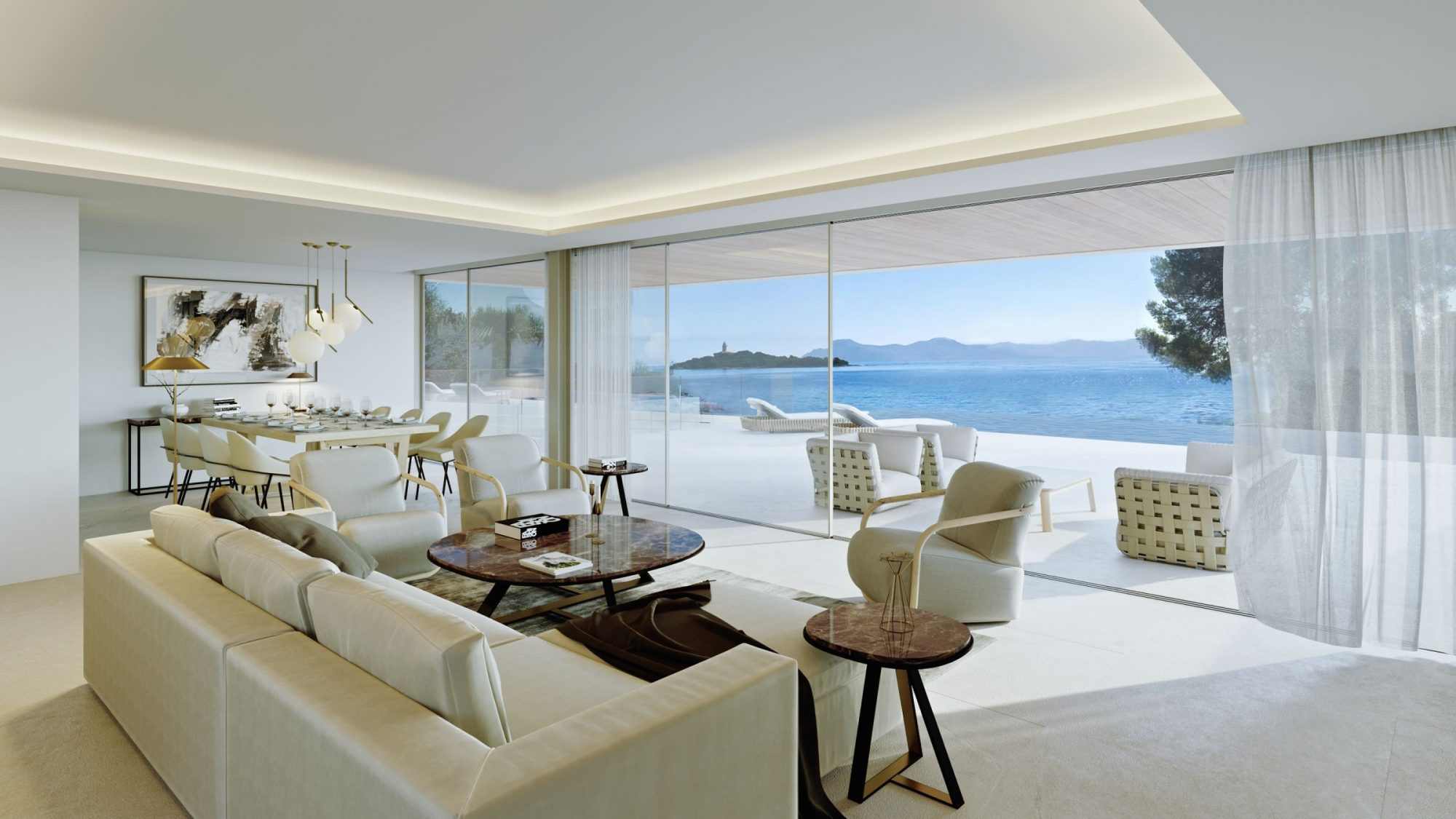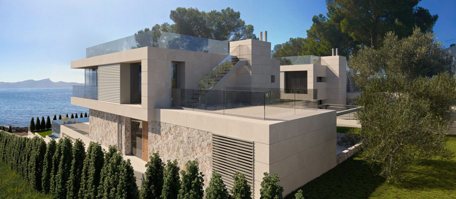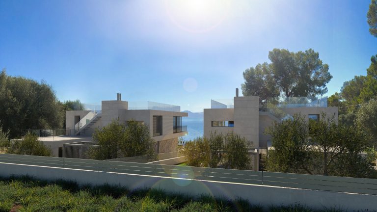 Dos viviendas simétricas en primera línea de costa, con la visión matizada por un bosque de pinos. Las viviendas se abren a la bahía de Alcudia creando unos espacios de transparencia que relacionan las estancias con el entorno de la vivienda y las vistas al mar.