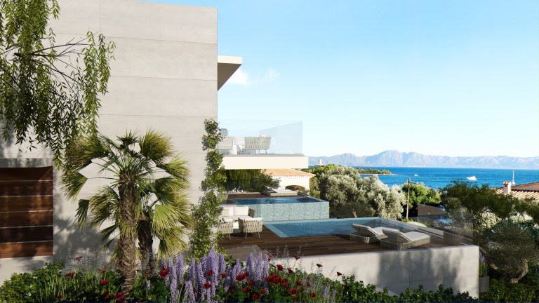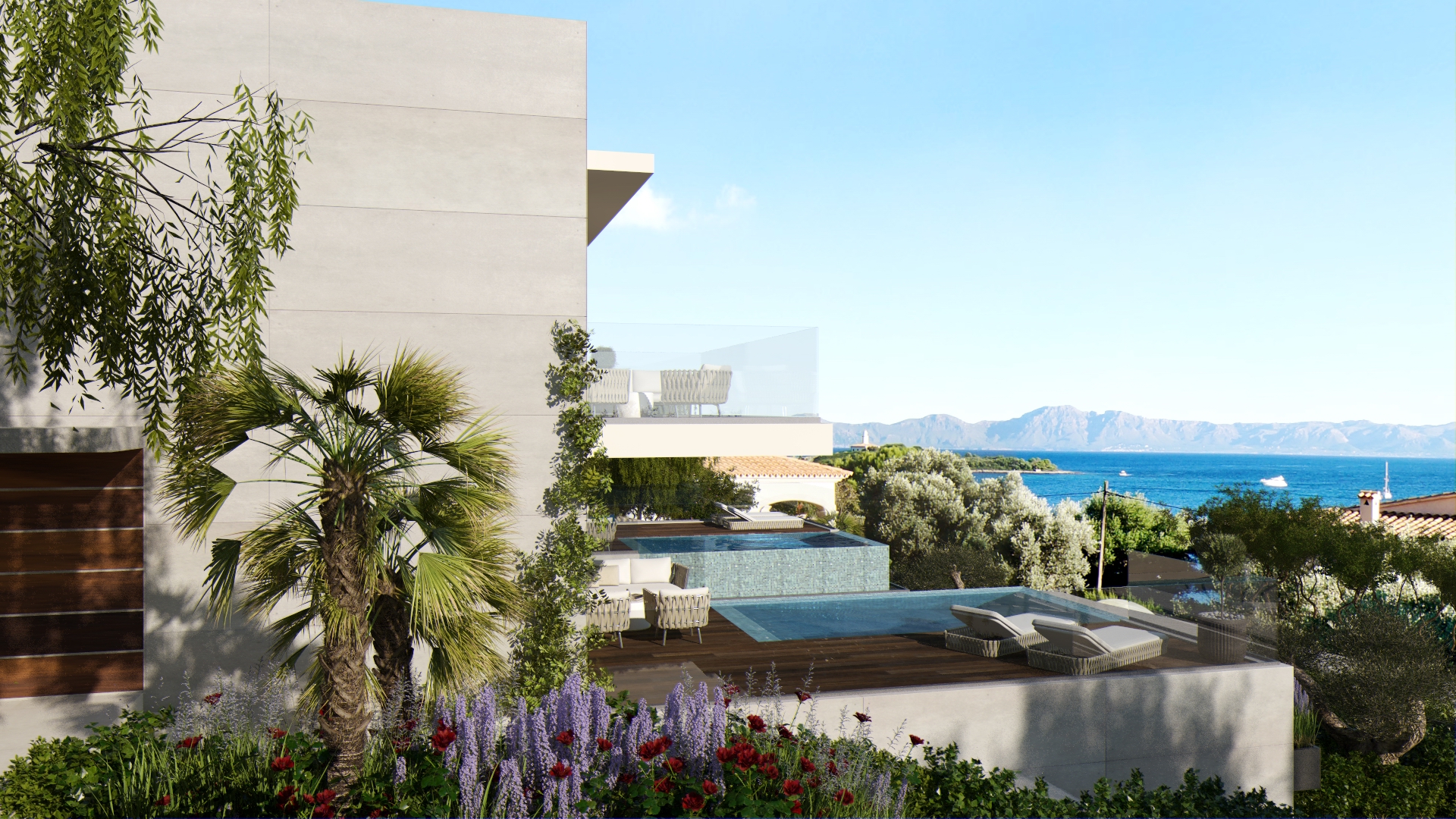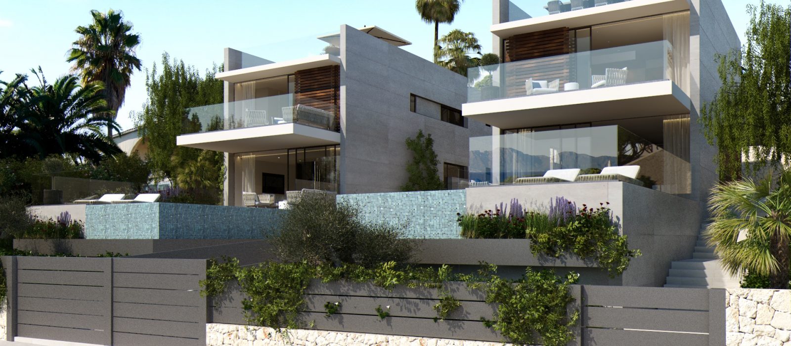 El cuerpo de estas viviendas simétricas se asientan en la pendiente de la montaña de Aucanada desarrollando una transversalidad de comunica la ladera con la bahía de Alcudia.