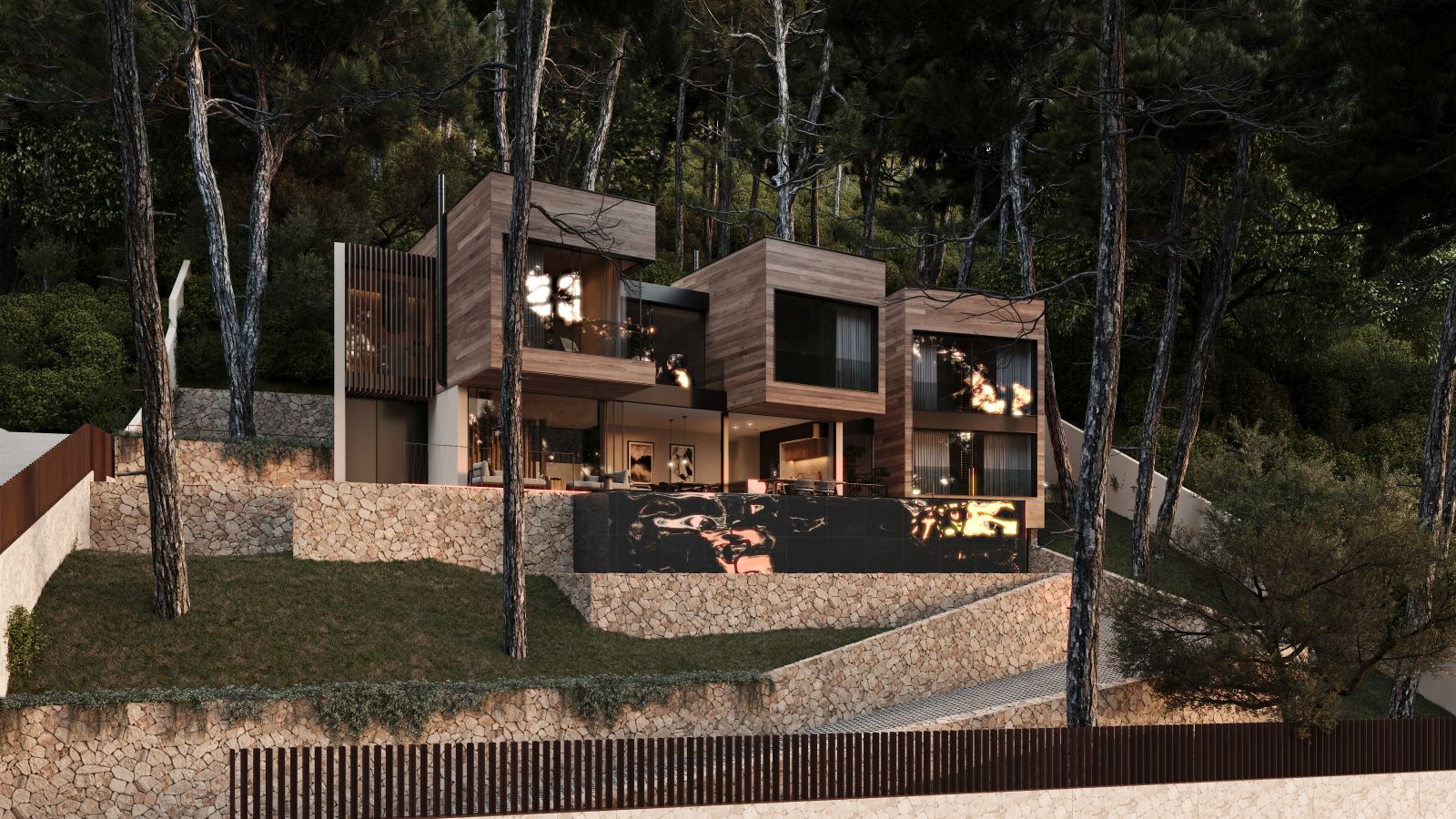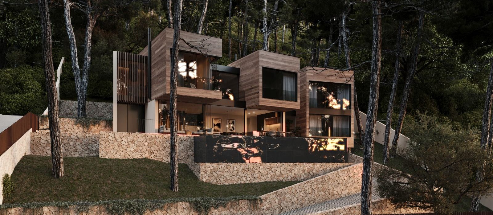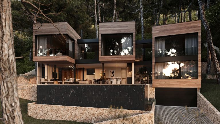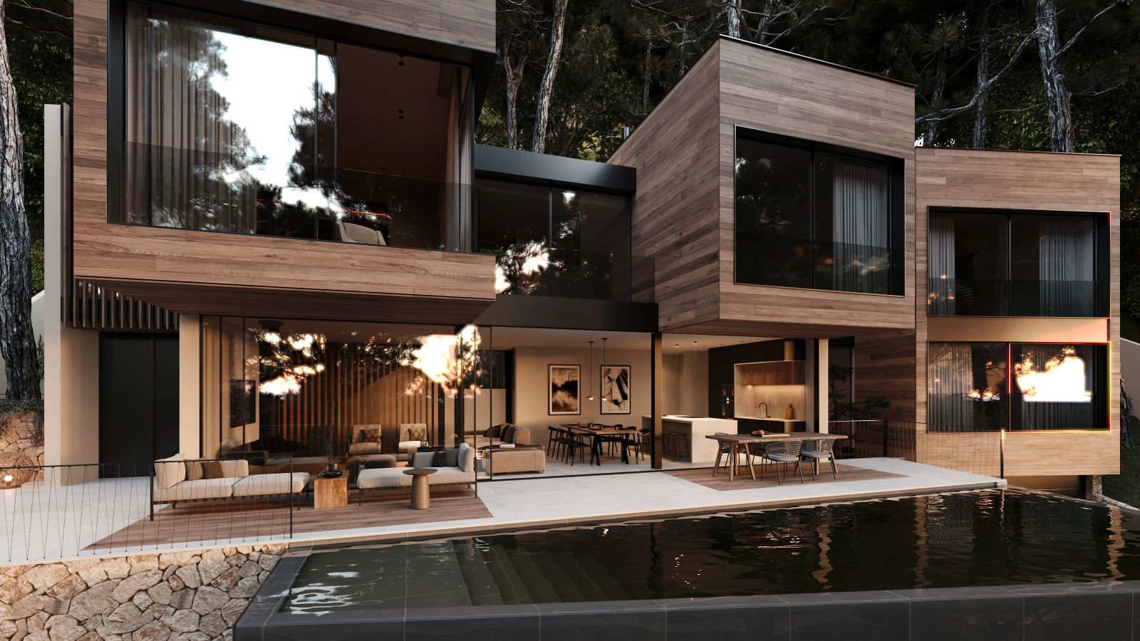 Desde el punto de vista volumétrico, se trata de un proyecto muy singular totalmente coherente con la distribución en planta. Destacan tres cuerpos en voladizo que parecen levitar sobre el terreno cuyo revestimiento exterior es a base de madera, con la intención de mimetizarse en el entorno.