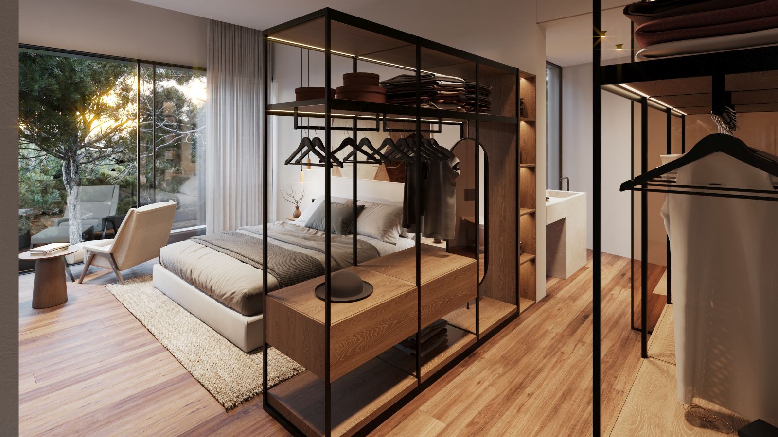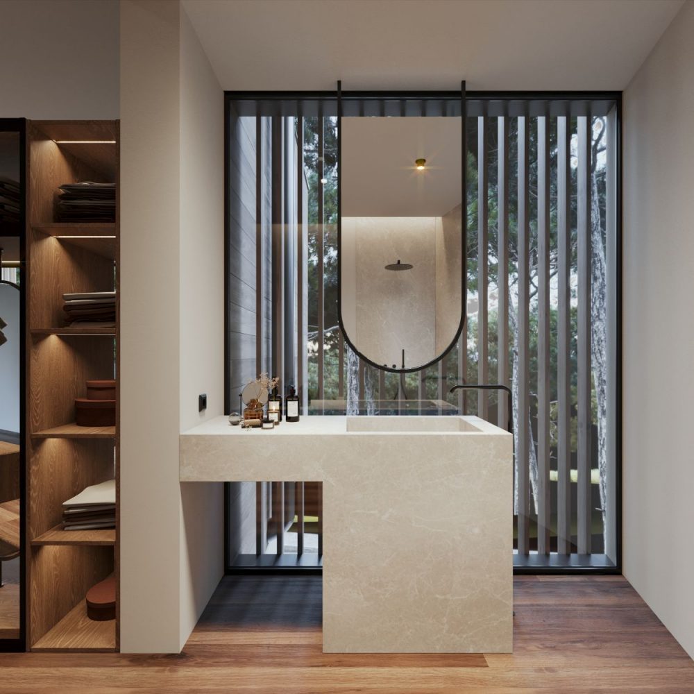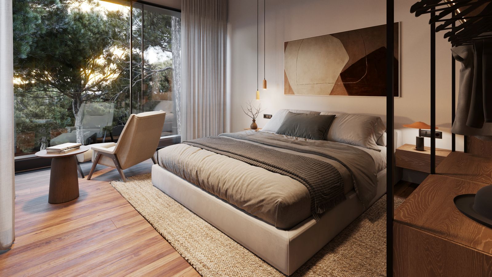 Desde el punto de vista volumétrico, se trata de un proyecto muy singular totalmente coherente con la distribución en planta. Destacan tres cuerpos en voladizo que parecen levitar sobre el terreno cuyo revestimiento exterior es a base de madera, con la intención de mimetizarse en el entorno.