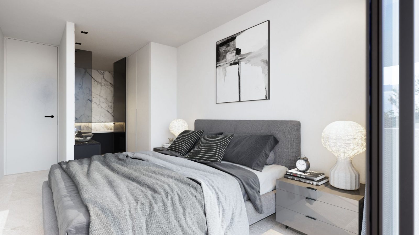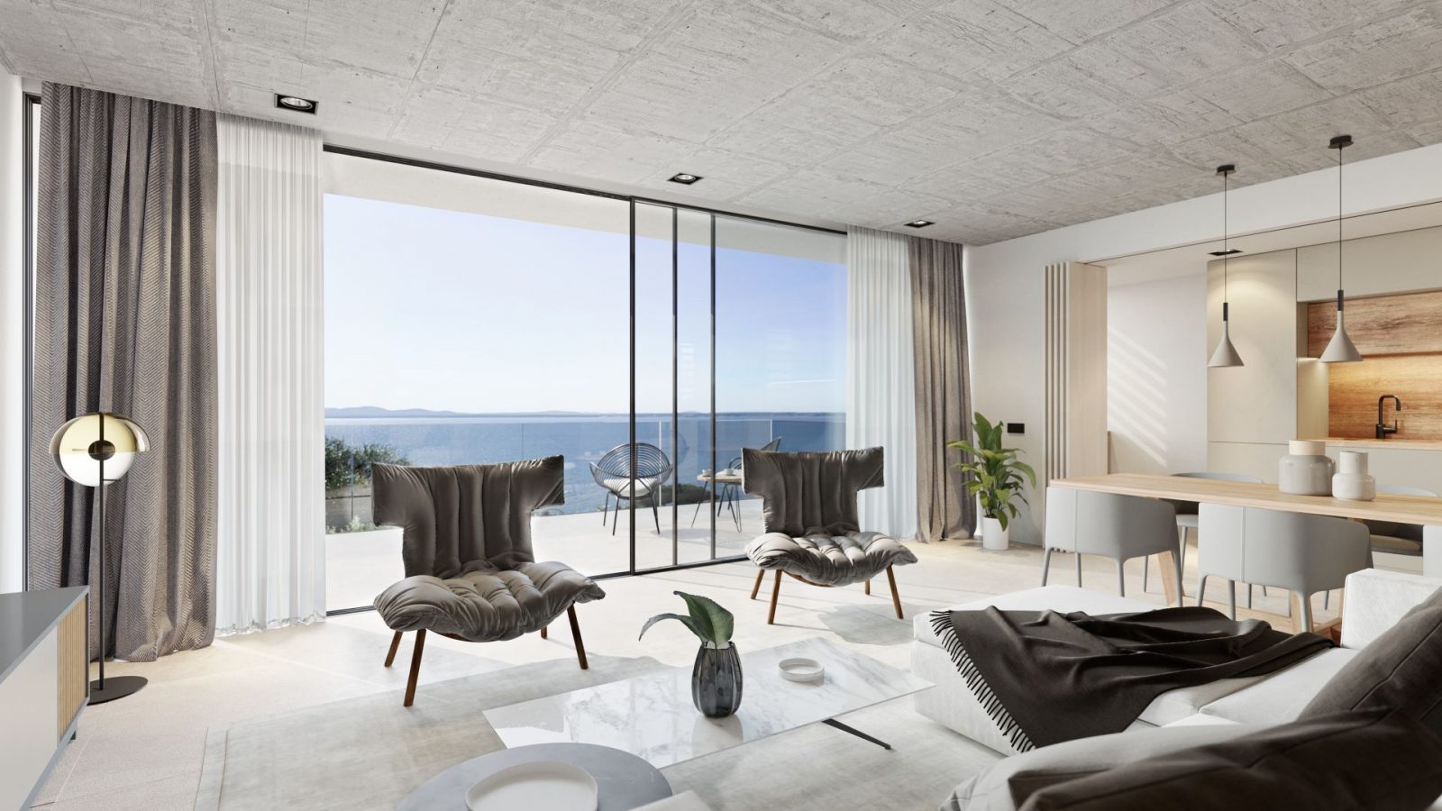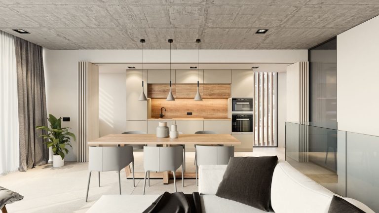 En la planta inferior se distribuye el programa de noche abierto con grandes ventanales a la terraza/solárium, piscina y jardín.