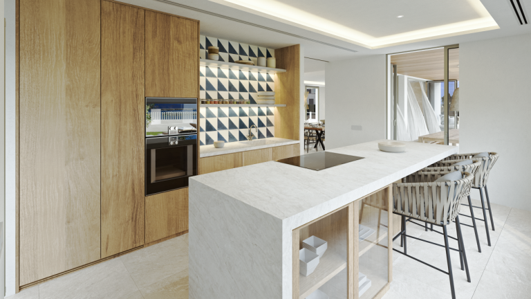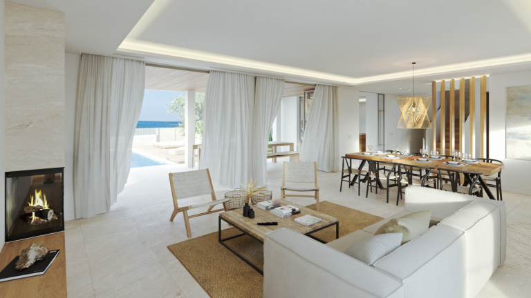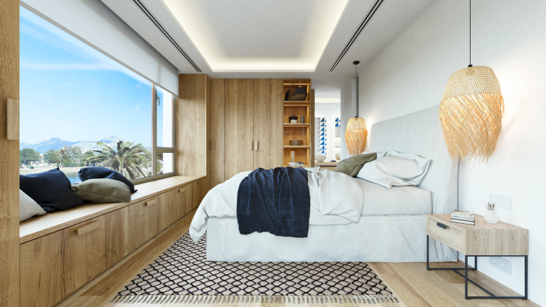 Se potencian las privilegiadas vistas a Formentor, con un tratamiento interior en el que los espacios crean un ambiente mediterráneo y natural, acentuado por materiales tradicionales como la baldosa hidráulica, la madera o la piedra local.
